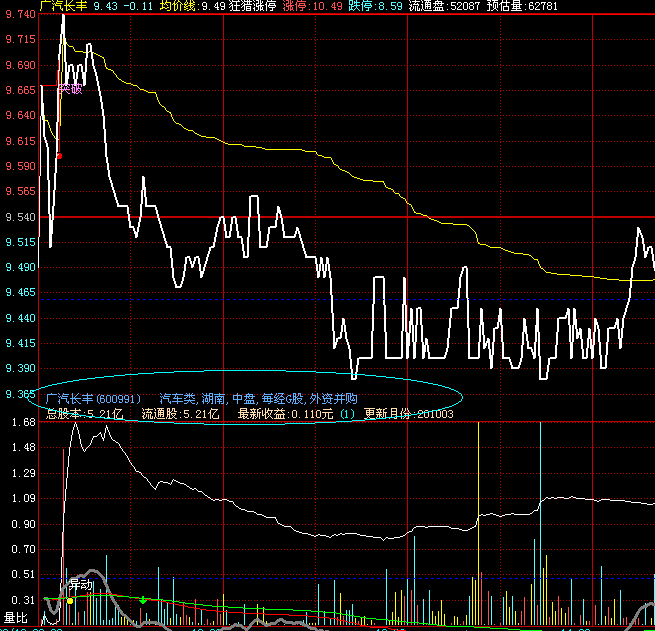 相关简介:把下面代码加入你的飞狐分时指标公式: rq:=FINANCE(0); Y1:=IF(rq=201003,1,2); DRAWTEXTEX(CLOSE,0,300,394,'('+NUMTOSTR(y1,0)+')'),COLORCYAN; DRAWTEXTEX(CLOSE,0,8,379,STKNAME+'('+STKLABEL+')'+' '+STRLEFT(BLKNAME,48)),ColorFFB060; DRAWTEXTEX(c,0,2,394, ' 总股本:'+NUMTOSTR(FIN