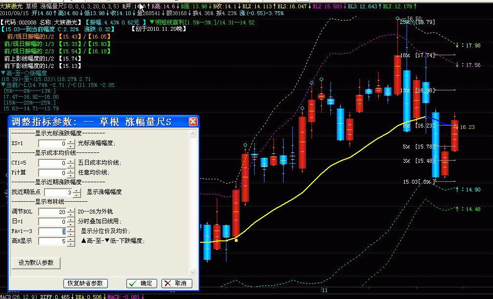 相关简介:此指标是以不同条件综合研判作参考买卖。以EMA17为价托参考涨幅度X% MACD 量 布林线做决断。只作为参考提示!! 指标无好坏,不同设定的条件理解就是好的。 {草根 涨幅量尺} INPUT:XS(0,0,1),CY1(0,0,5),p2(0,0,255),df(0,0,555),BOL(0,0,999),FA(0,0,3),高H(0,0,255); STICKLINE(C=O,low,high,0.5,0),colorFF; STICKLINE(C=O,close,open,8,0),col