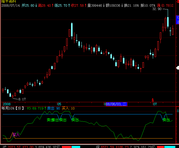 相关简介:做股票不是简简单单的买和卖,它蕴含着很多底蕴和技巧。 再好的指标,再好的提示信号。在我们没有解决心理问题之前,都属于无效信号,所以、往往大好时机就这样擦肩而过。 请注意!这里可不是在怂恿大家现在必须买,什么时候买?您说的算! 勉为其难,抛砖引玉,今天做了一个MACD、KD结合的指标。 一周保你赚10%!这话我不能说,但应该没有多大问题。 关键在我们怎么用! 请看图: 个股实例: 以前的: 指标源码: 一段再简单不过的源码 V1:=EMA(CLOSE,5)-EMA(CLOSE,340); V2: