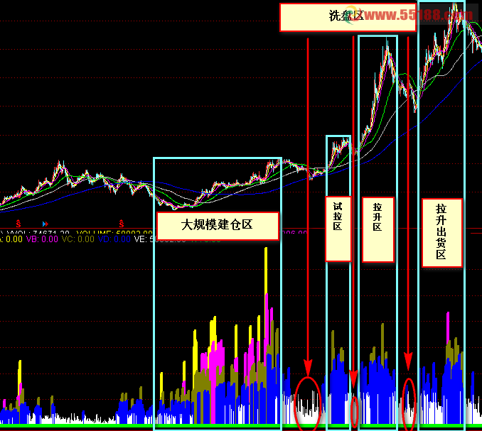 究竟怎么看成交量,找了不少指标,还是看不明白,罢了,自己搞吧,于是,就有了下面的自用成交分级图,拿出来与同学分享:
