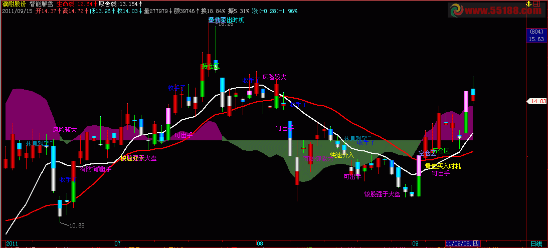 相关简介:在实战交流区地主会中发了个主图,只是在原图的基础上加了MACD,优化了一下,在飞狐软件中用觉得不错,给大家分享下。