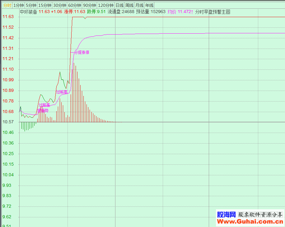在分时图和一分钟图上显示信号的预警,如果你的软件是全推数据那么就可以设定预警跟踪,如果你只关心你的个股和跟踪的自选股也可以随时关注,但信号出现预警时一定要结合大盘及板块的形态来决定操作