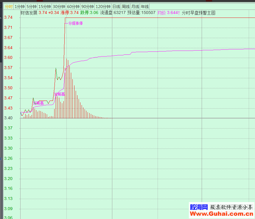 相关简介:飞狐分时预警主图 源码 在分时图和一分钟图上显示信号的预警,如果你的软件是全推数据那么就可以设定预警跟踪,如果你只关心你的个股和跟踪的自选股也可以随时关注,但信号出现预警时一定要结合大盘及板块的形态来决定操作 DIF:=EMA(CLOSE,12)-EMA(CLOSE,26); DEA:=EMA(DIF,9); 涨幅0:=C/DYNAINFO(3); 限制0:=涨幅01.01 AND 涨幅0=1.06; 虎:=DYNAINFO(11)+(DYNAINFO(11)*0.02); Q:=(REF(C,