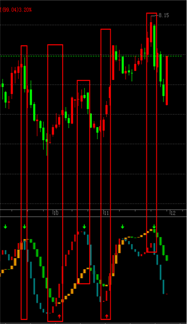 该指标有几个小技巧,下跌中,绿色压蓝色,下跌力度会较大,而且非常的坚决,黄色与红色重叠,红色方框在黄色下方则上涨力度大。