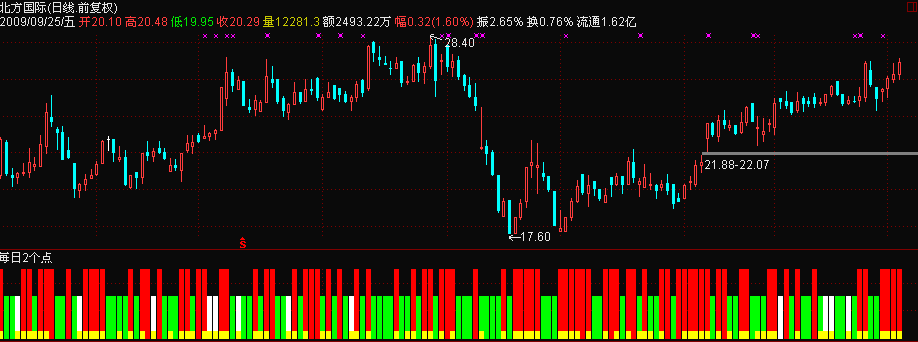 相关简介:个股每日最高价达到2个点的日子有一半,下图红色高柱子表示当日最高涨幅达到2个点,绿色表示最高涨幅低于0.5个点,白色表示不亏,如果每日尾盘买进,次日涨2个点卖出,低于2个点也卖出,这样一个月下来,算一下,差不多不输不赢,为了提高盈利减少失败,我每日只买入收阳线的个股,这样就提高了一点,再下去由于水平有限无法断续,请高手研究下有什么办法能够提高扑捉率,在此向你表示忠心的感谢! 如果有人研究出来,我希望能公布出来给大家使用,如果实在不能公布,只愿你还能告诉我,下面是我自己用通达信写的: C/C++