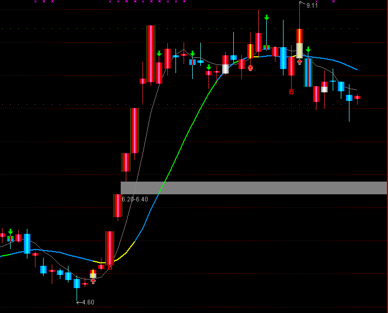 - STICKLINE(CLOSE>REF(CLOSE,1)*1.0985 AND CLOSE=HIGH,CLOSE,OPEN,4,-1),COLOR00FFFF;