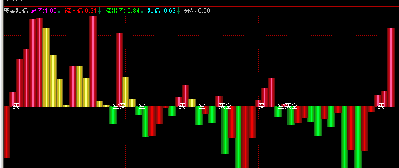- 流入亿:IF(CLOSE>OPEN,VAR1*(HIGH-LOW),IF(CLOSE