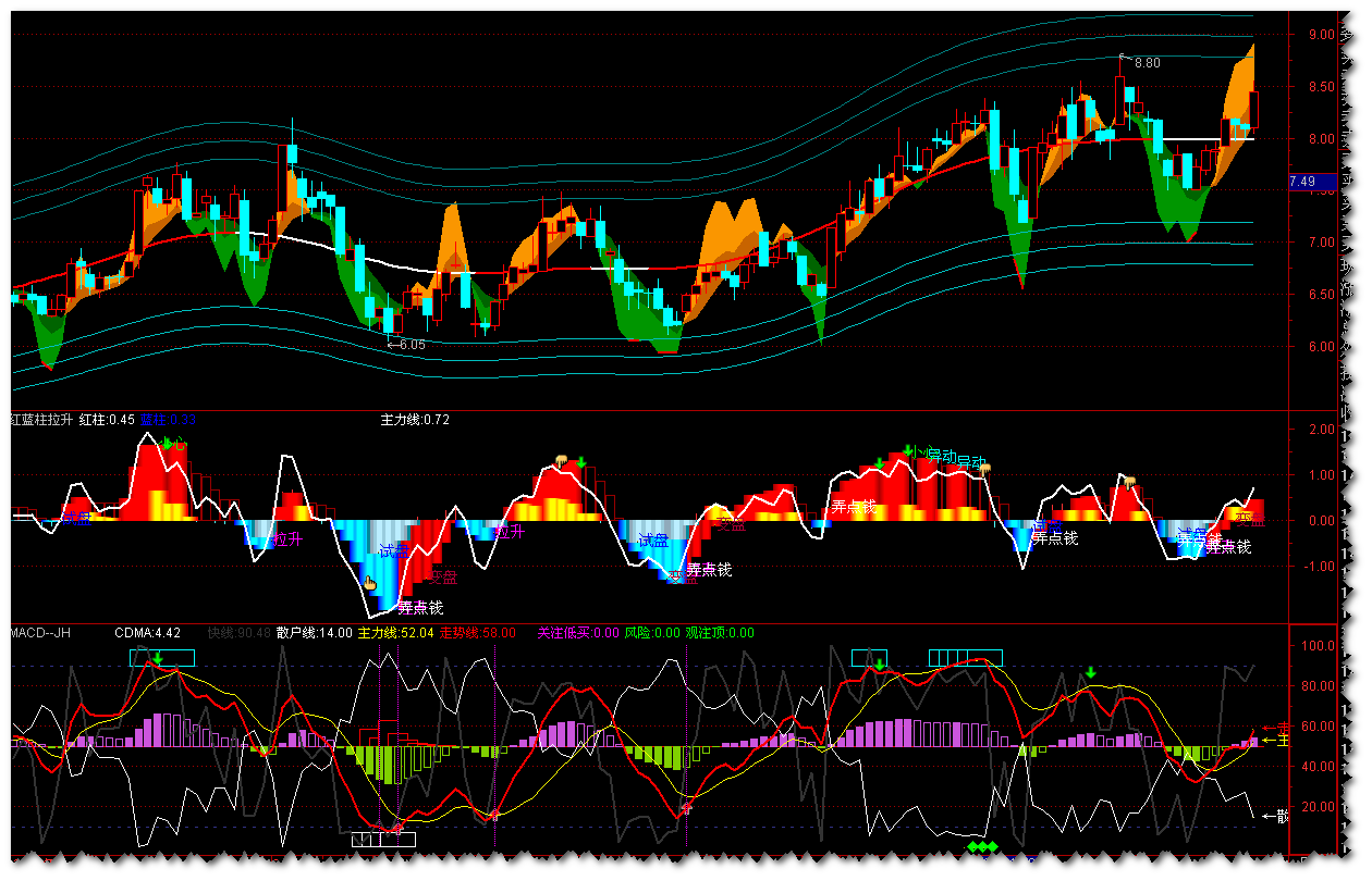 - STICKLINE(CDMA<=0 AND CDMA<=REF(CDMA,1),50,50+CDMA,2.5,0),COLOR00D080;