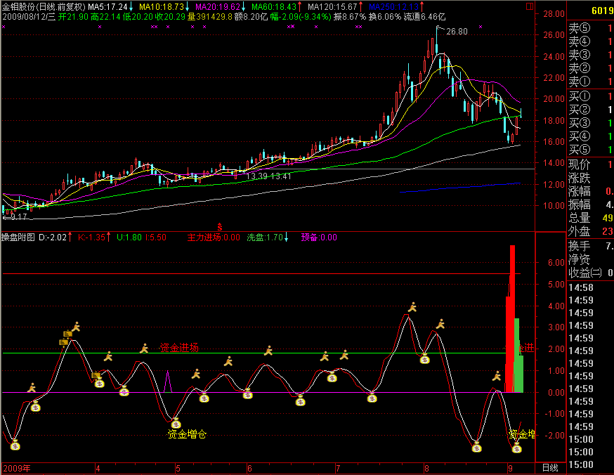 - DRAWTEXT(A11=5,2,'资金进场'),COLORRED;