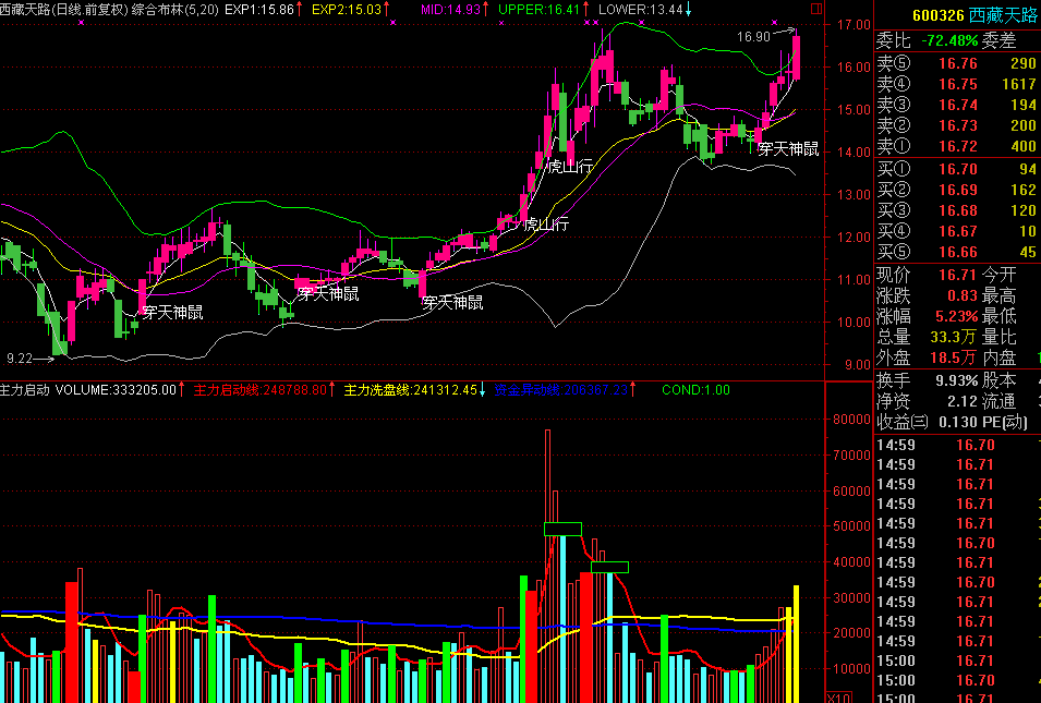 - DRAWTEXT(CLOSE>UPPER AND V/REF(V,1)>2,L,'虎山行');