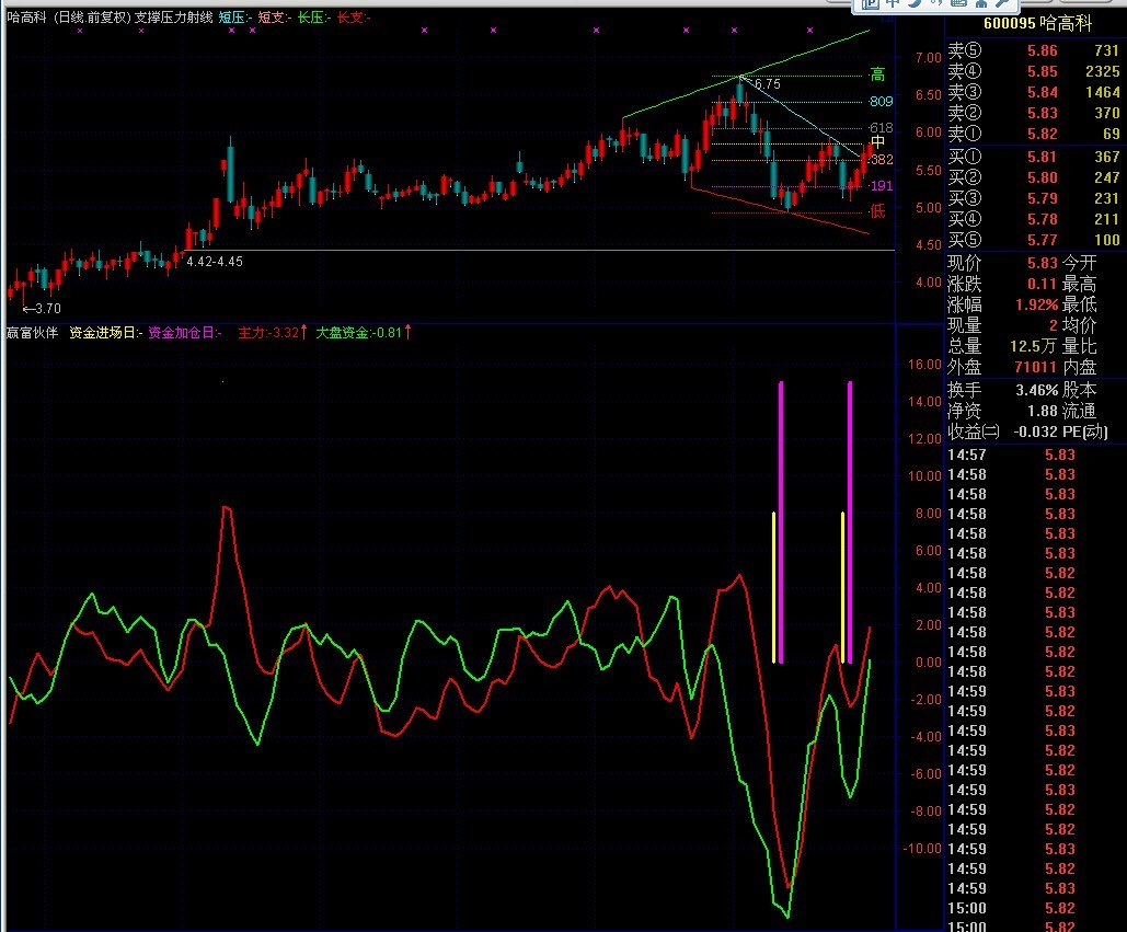 - 资金加仓日:IF(A12>0,15,DRAWNULL),COLORFF00FF,LINETHICK4,STICK;