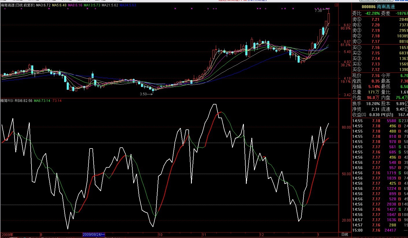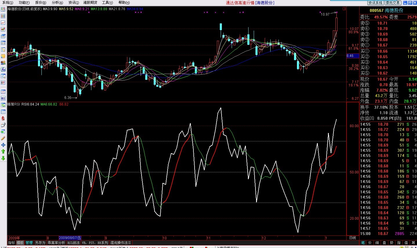 相关简介:rsi还是属于比较经典的指标的,指标更多的用于顶底背离的判断。 本指标是利用6日rsi对6日均线的位置做买卖判断的 根据均线大小变化做持币还是持股判断。 指标操作方法: 红线持股,绿线持币 白线上穿均线为买点,下穿均线可以做减仓和卖出操作。 指标设三条虚线,第一条为70线,rsi(白线)在70线以上形成头肩顶,双重顶,而股价继续上升,形成R顶背离,说明股价见顶。 第三条虚线为30线,rsi(白线)在30线以下形成头肩底,双重底,而股价继续下跌,形成R底背离,说明股价见底。 50线为多空分界,50