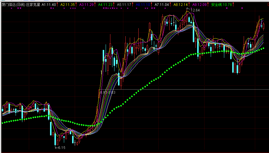 A、当“神奇中线”、“神奇短线”发出买入信号时,如果K线在“安全线”(绿色)之下,可以试建仓,做反弹,但必须快进快出;一旦K线站在“安全线”(绿 色)之上,并且有成交量的配合即可加码建仓,此时为较佳的买点。然后可看长做短,一路持股并等待短线指标或“神奇中线”或“神奇短线”发出卖出信号,然后 回避短线调整或清仓离场。“神奇均线”的特色功能,除能实时提示相对安全的“买点”之外,非常重要的是它从A1~A7的形态特征上可以清晰的作出判断其基 本的“趋势”是上升还是下降。在具体操作中我们可以““神奇中线”(A1~A7)不封闭,继续持股不持币”的原则确定是否继续持股待涨