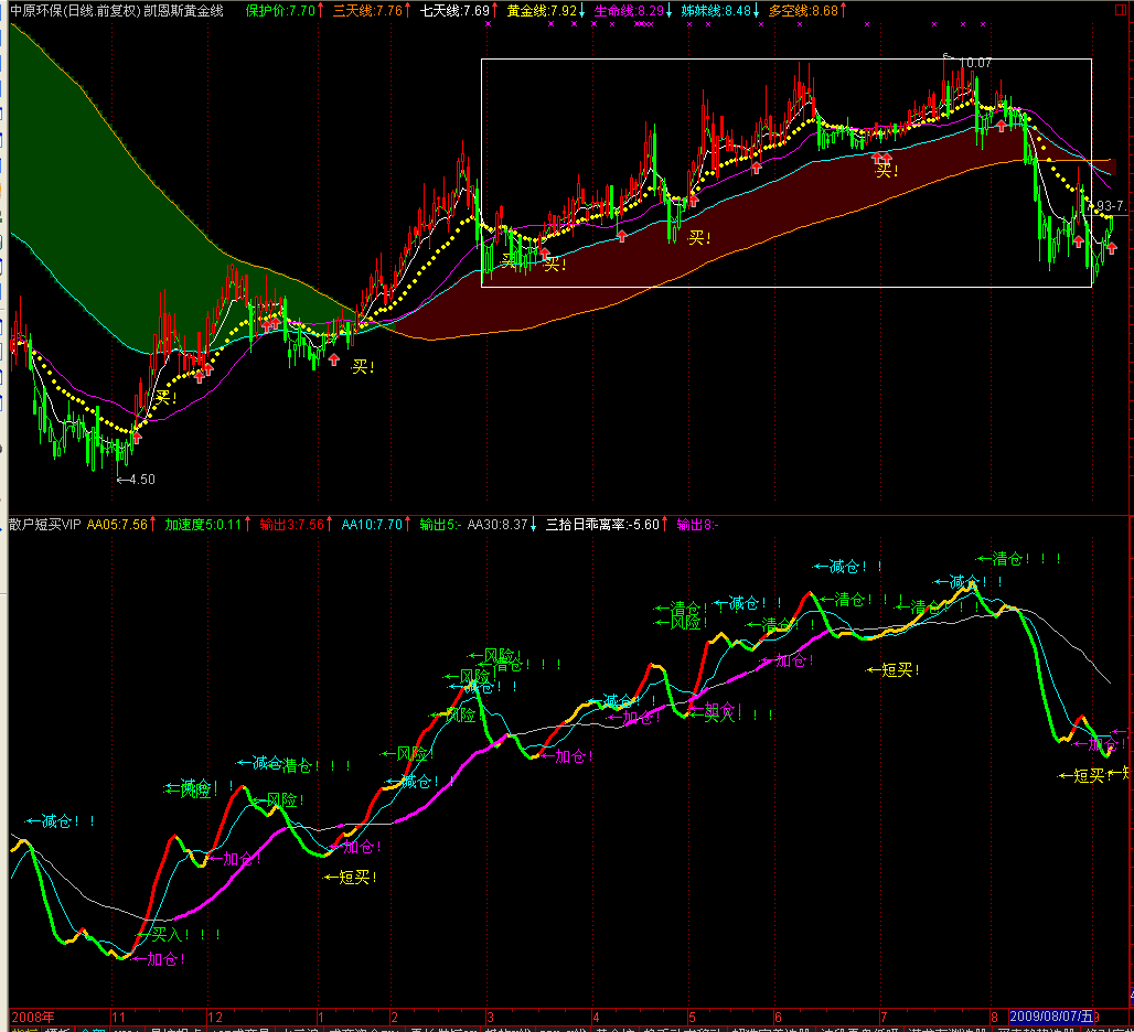 - {DRAWTEXT(((HH>70) AND CROSS(D,K)),(LOW * 1.13),'←减仓!'),COLORFF00CC;};