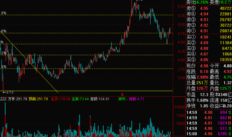 - STICKLINE(主动卖<0,VOL,主动买,1,0),COLOR808000;