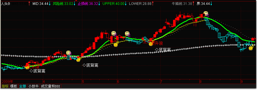 - DRAWTEXT(CROSS(MA5,界),(LOW * 0.80),'◇底背离'),COLORWHITE;
