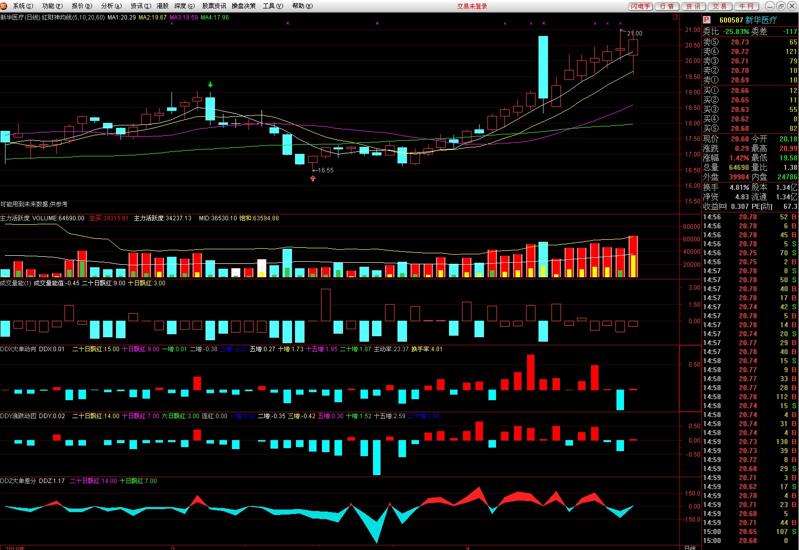 DDX和DDY的相对增减,可判断主力的动向。DDX便大,DDY变小,则主力在流出,DDX变小,DDY变大主力在增仓。