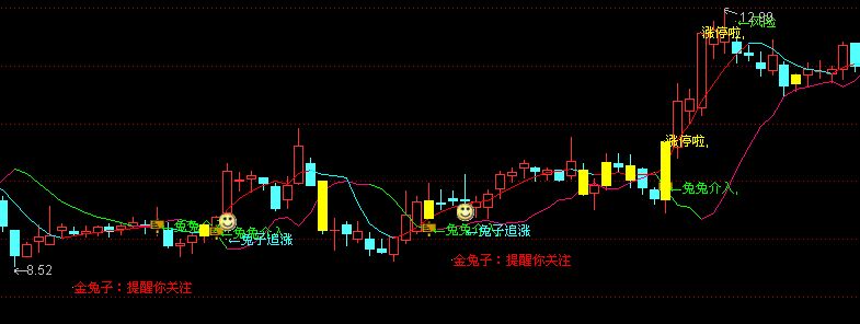 - DRAWTEXT(FILTER(平衡>REF(平衡,1)AND HHV(MA((HIGH+CLOSE)/2,13),10)REF((CLOSE+LOW)/2,1),5)AND 限制<88,LOW*0.95,'←兔子追涨'),,COLORFFFF33;