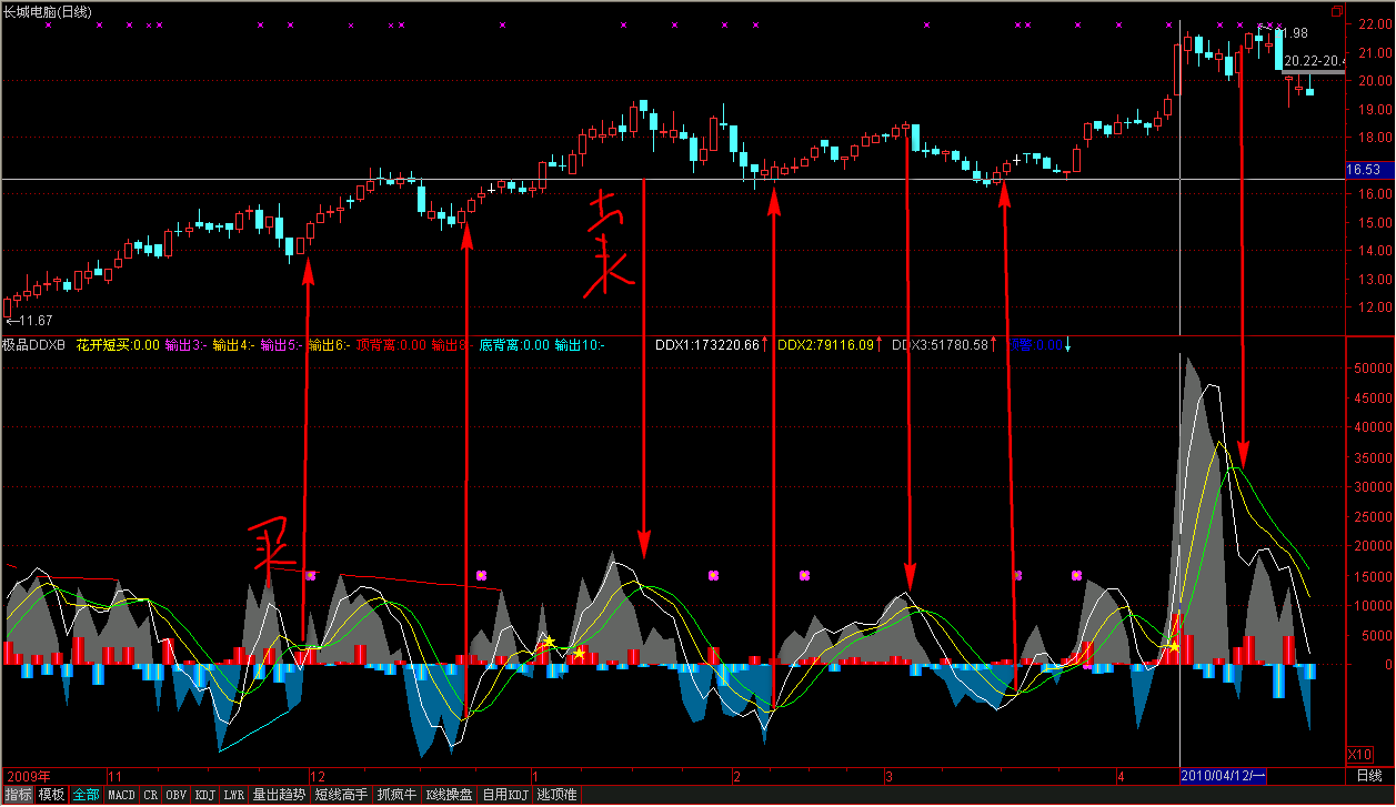 - 预警:DDX>0 AND MA(V,5)>MA(MA(V,5),5) AND CROSS(DDX1,DDX2),LINETHICK;