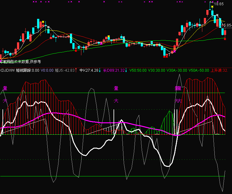 - 下跌浪: IF(VAR1<0,VAR2,0),COLOR00FF00,LINESTICK;