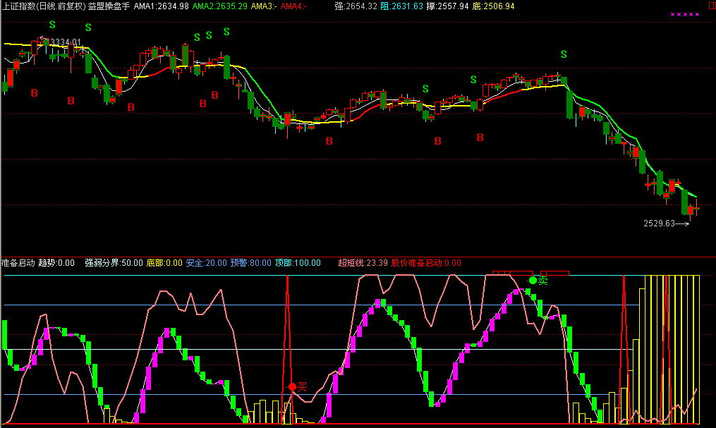- 超短线:(((主力线-LLV(主力线,21))/(HHV(主力线,21)-LLV(主力线,21)))*(4))*(25),LINETHICK2,COLORLIRED;