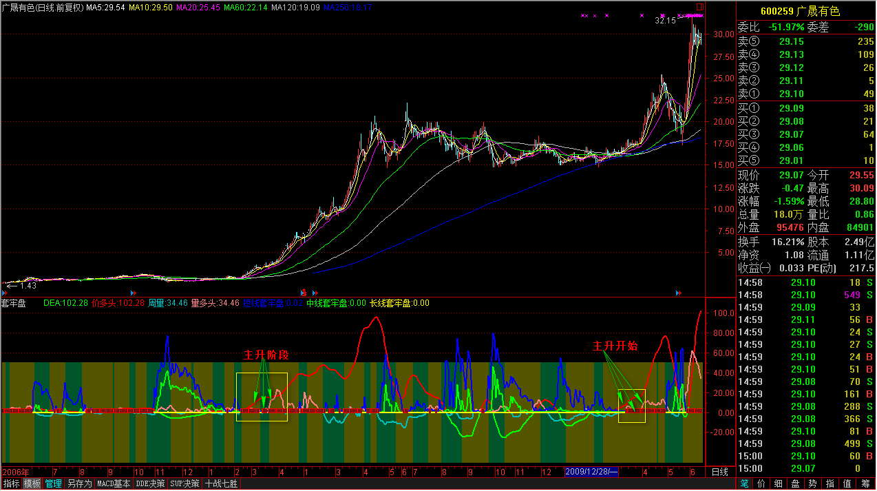 将以上几个指标综合起来做成的附图指标,量,价,波段,趋势,集于一身;主升阶段,一网打尽;