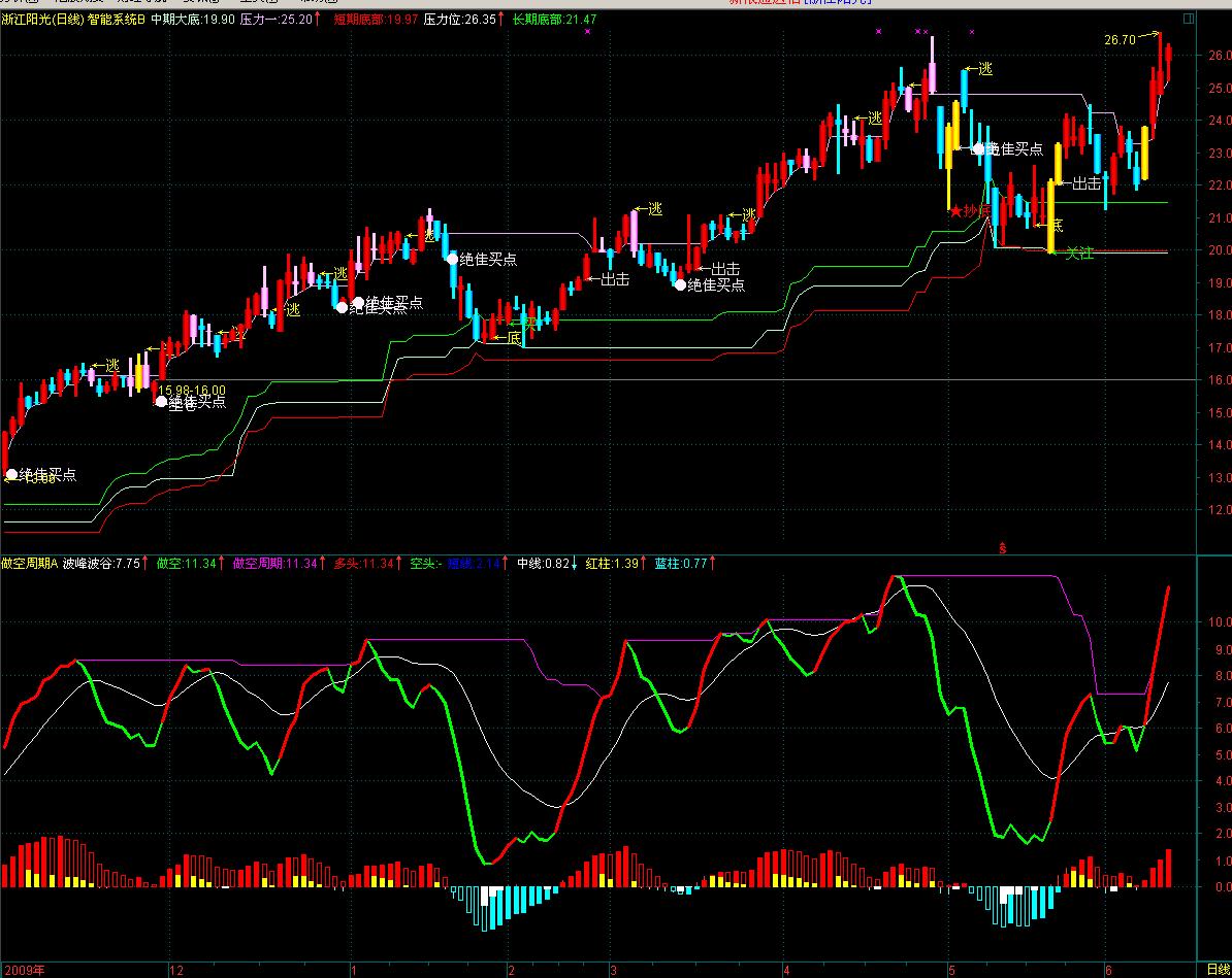 - 长期底部:LLV(HIGH,30),COLOR00FF00;
