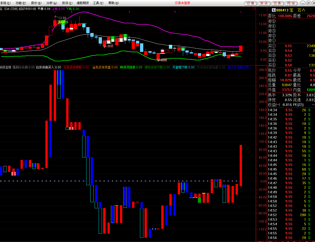 相关简介:通达信波段宝塔副图指标源码 {波段宝塔(副) 无未来函数,可放心使用} 波段宝塔线(副图)指标使用须知: 波段宝塔线(以下简称宝塔)是以几种颜色(虚体,实体)的实体棒线来划分股价的涨跌,及研判其涨跌趋势的一种线路,也是将多空之间拼杀的过程与力量的转变表现在图中,并且显示适当的买进时机,与卖出时机。 它的特征与点状图类似,亦即并非记载每天或每周的股价变动过程,而乃系当股价续创新高价(或创新低价),抑或反转上升或下跌时,再予以记录,绘制。 运用原则 一般宝塔线分析要点如下: (1)宝塔线翻白(红)之