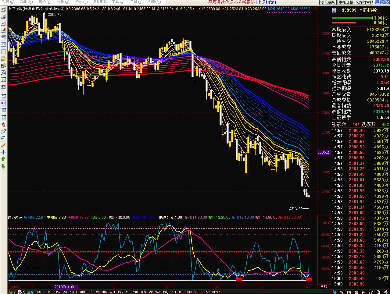 - 见底:(REF(中期线,1)>85 AND REF(短期线,1)>85 AND REF(长期线,1)>65) AND CROSS(长期线,短期线);