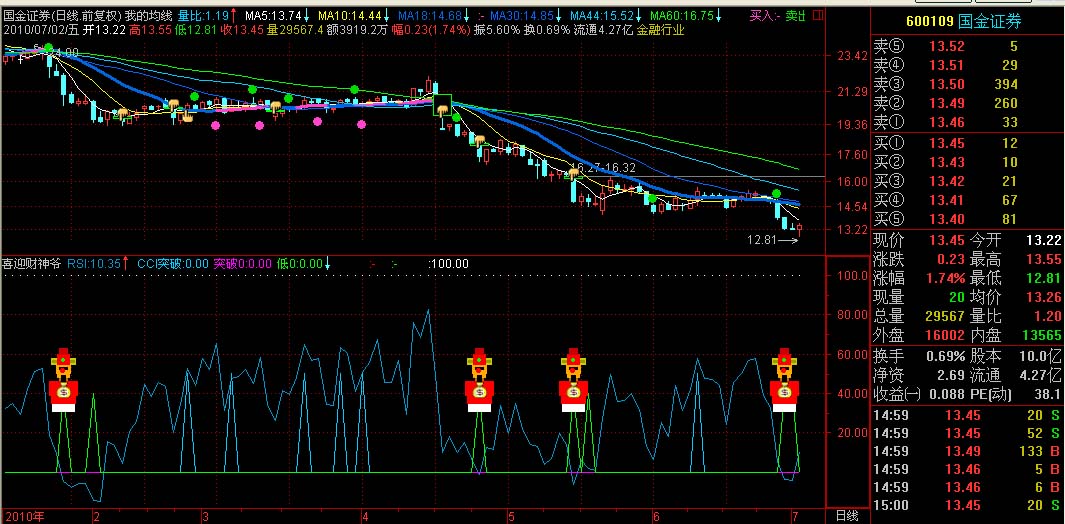相关简介:通达信喜迎财神爷副图源码 {公式在线提供: www.gszx.com.cn } 复制内容到剪贴板 {喜迎财神爷} LC:=REF(C,1); CCI:=((C-MA(C,14))/(0.015*AVEDEV(C,14)))/4+50,COLORFFCCCC; RSI:SMA(MAX(C-LC,0),6,1)/SMA(ABS(C-LC),6,1)*150-30,COLORCC9900; VAR01:=DYNAINFO(17)*REF(MA(V,5),1); VAR02:=D