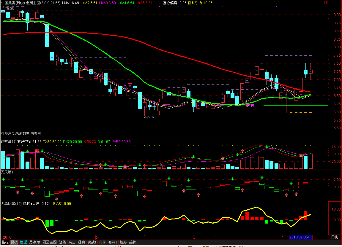 - 短趋:=(8*AAA0+7*REF(AAA0,1)+6*REF(AAA0,2)+5*REF(AAA0,3)+4*REF(AAA0,4)+3*REF(AAA0,5)+2*REF(AAA0,6)+REF(AAA0,8))/36;