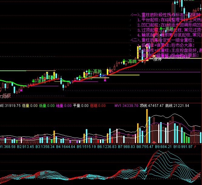 - MV1: (MA(VOL,3)+MA(VOL,5)+MA(VOL,8)+MA(VOL,13))/4,COLORMAGENTA;
