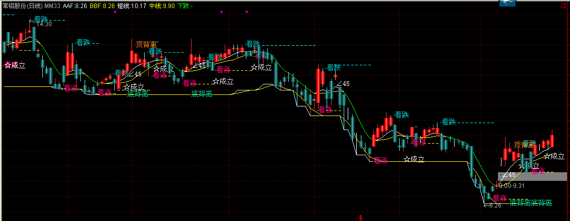 - DRAWTEXT(CROSS(FF,MA15),BBF,'底背离'),COLORA6E500;