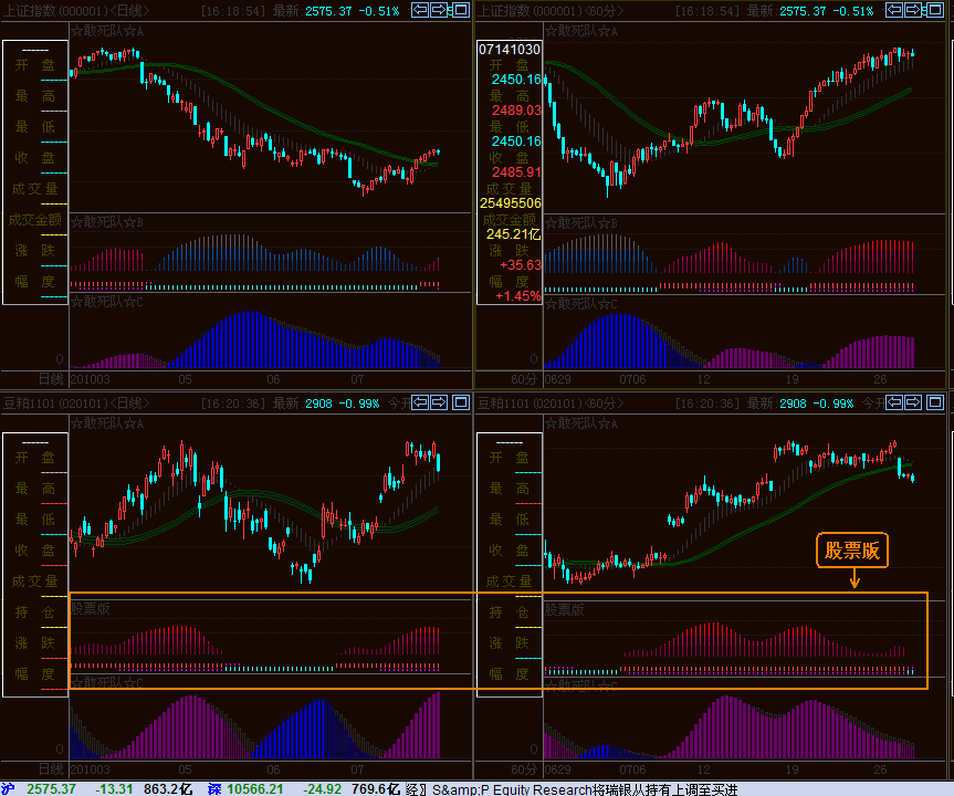 相关简介:通达信敢死队拉拉股票版贴图通用原码 先说两句 我擅长的只是多空划分及平衡点做抄底摸顶信号不是我的强项,因为这类信号总在准确率和分布率之间选择 做这公式再次印证了万变不离其宗 我没想到MACD的分多空和RMI的50线分多空居然契合度那么高 那直接用MACD来分多空,用RMI来表达MACD所划分的多头趋势的强弱表现(颜色和坐标线区分了) 朋友们可以理解成加速阶段,拉升阶段 {///////////////////////////////////////////////////////} A:=(C*