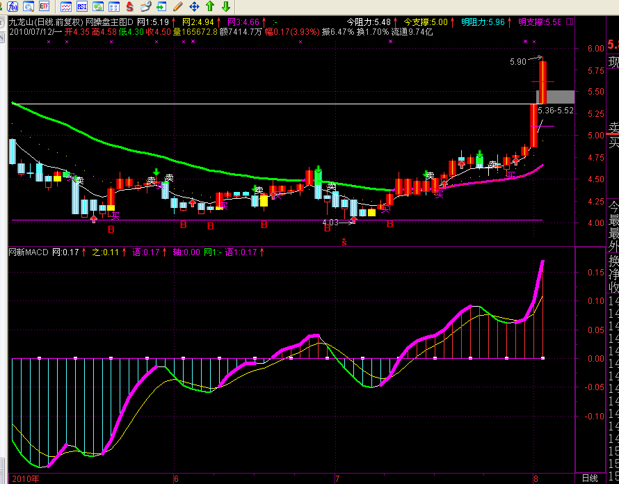 - 语1:IF(网>=REF(网,1),网,DRAWNULL),COLORFF00FF,LINETHICK5;