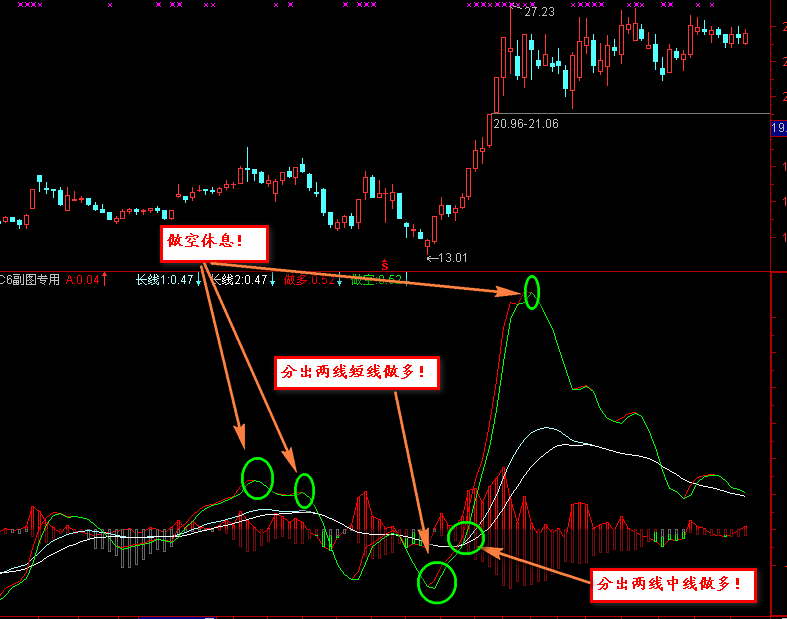 - 做空:IF(B1-A1,B1,A1),LINETHICK1,COLORGREEN;