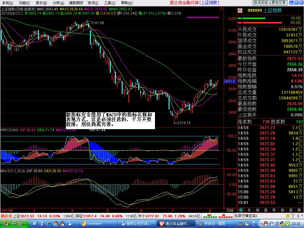 相关简介:通达信WRCD(整合龙腾四海和趋势顶底后的指标源码 MACD是大家最为常用的趋势型指标,不过该指标本身并没有确定的波动范围,判断高(低)位有时比较难。龙腾四海和趋势顶底也都是大家很熟悉的指标,其范围为0--+100,对于判断股价和指数的见顶见底很有作用。其实这两个都是威廉指标的变形和延伸,更符合投资者的习惯。经过观察,发现QSDD指标的走势很接近MACD,基本上可以用来代替后者。所以把龙腾四海和趋势顶底经过整合,合成一个指标,仍然保留了二者的用法(具体用法可以到论坛上查找),这样既可以观察股价和