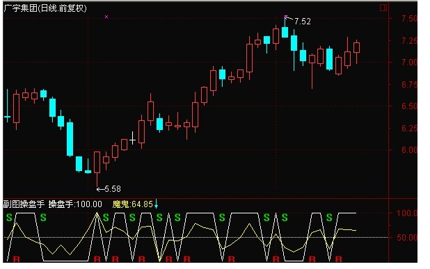 •《操盘手副图》源码如下。图示简洁明了,‘开关式’操作。一目了然。有一定的参考价值!不要小看只有区区几行源码哦,利用魔鬼线与股价的背离你可以做些有趣的抄底逃顶和高抛低吸的动作。各位也可将它移植在