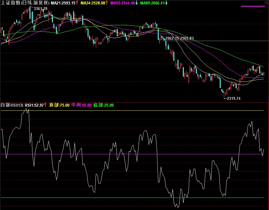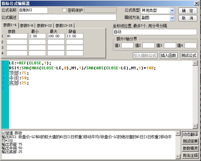 - RSI1:SMA(MAX(CLOSE-LC,0),N1,1)/SMA(ABS(CLOSE-LC),N1,1)*100;