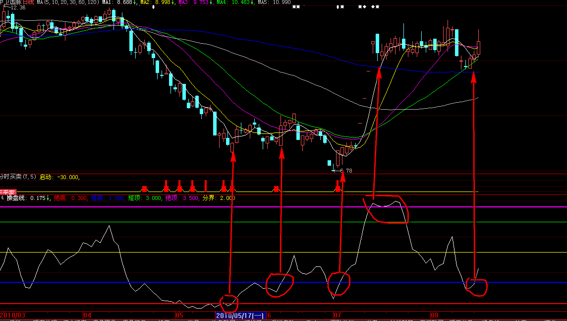 - 操盘线: EMA((CLOSE-Var1)/(Var2-Var1)*4,4);