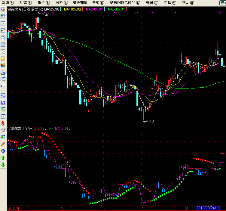 相关简介:通达信宝塔线+SAR副图指标源码 C/C++ www.gszb.com 股票公式指标网提供 Code 复制内容到剪贴板 宝塔线+SAR指标副图: VAR1:=SAR(10,2,20); S:IF(VAR1C,VAR1,DRAWNULL),COLORRED,CIRCLEDOT; X:IF(VAR1C,VAR1,DRAWNULL),COLORGREEN,CIRCLEDOT; B1:=REF(C,1);B2:=REF(C,2); SS:=IF(CREF(C,1)ANDREF(C