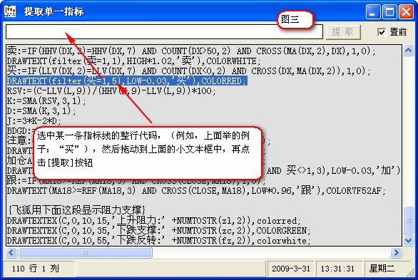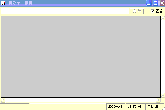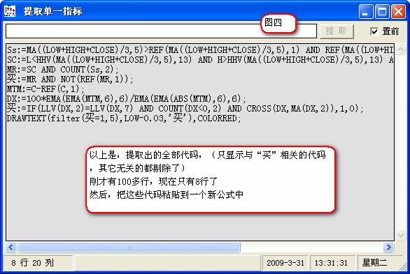 相关简介:通达信公式指标提取小工具公用 使用说明:状态栏共四个窗格(从右往左)双击不同的窗格,会有不同的作用, 第1个窗格:双击后使文本框清空; 第2个窗格:双击后是复制,相当于CTRL+V; 第3个窗格:双击后,出现查找与替换对话框; 第4个窗格(左数第一个),双击后起到还原的作用,即:恢复最后一次进行CTRL+V的操作的内容 还有,每当将鼠标移到文本框每行的行首,光标会变粗,此时可直接双击就能快速的选中整行文本 {公式在线提供: www.gszx.com.cn } 图片说明: