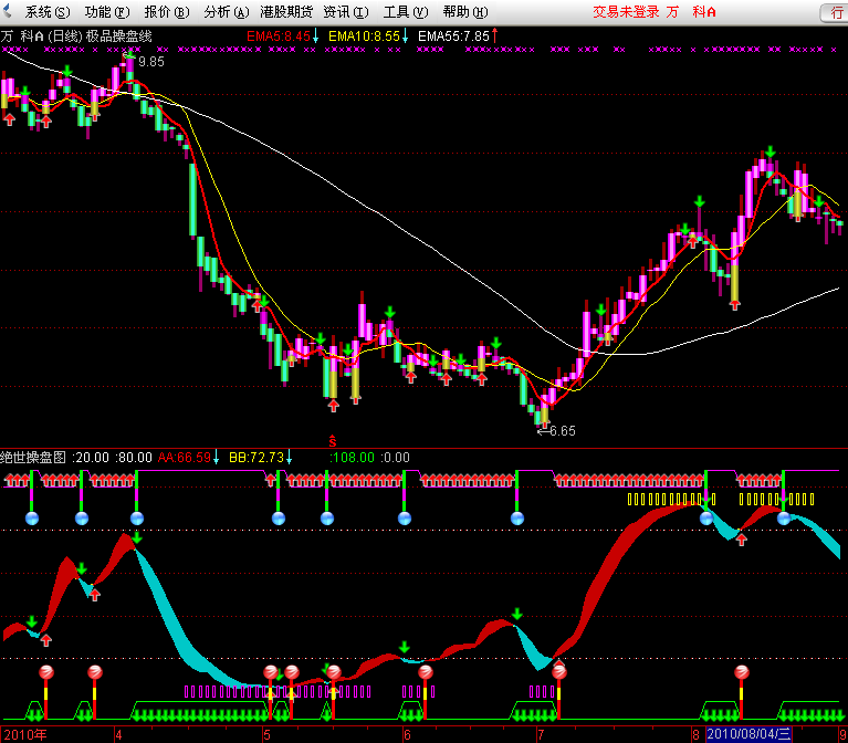 相关简介:通达信绝世操盘图副图指标源码 C/C++ Code 复制内容到剪贴板 20,POINTDOT; 80,POINTDOT; VAR1:=(2*C+H+L)/4; VAR2:=LLV(LOW,34); VAR3:=HHV(HIGH,34); AA:EMA((VAR1-VAR2)/(VAR3-VAR2)*100,5),COLORRED; BB:EMA(AA,5)COLOR00FFFF; DRAWBAND(AA,RGB(200,0,0),BB,RGB(0,200,200)