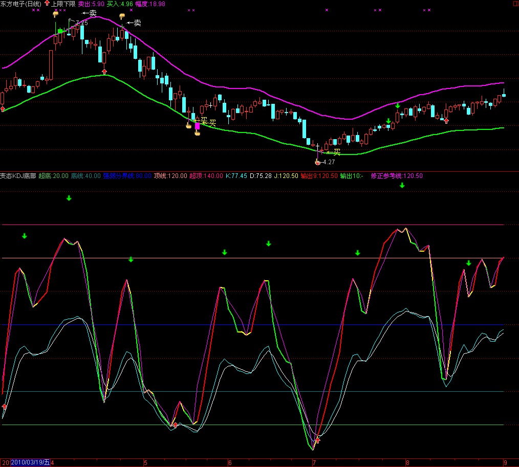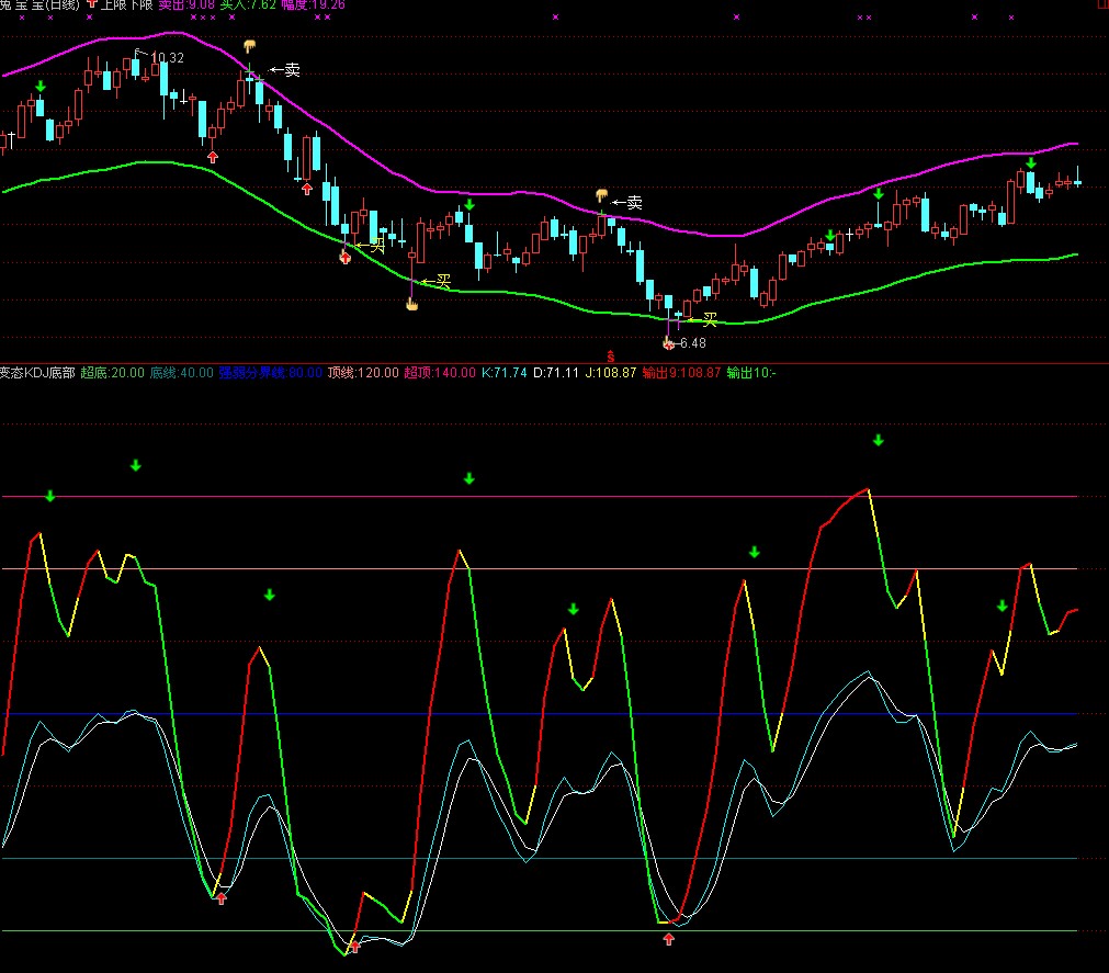 本公式是普通(KDJ)修改成变态版专为趋势探底用简单易明,请各位高人多多给点意见,使其更加完美,造福广大的股友们赚钱步步高升!