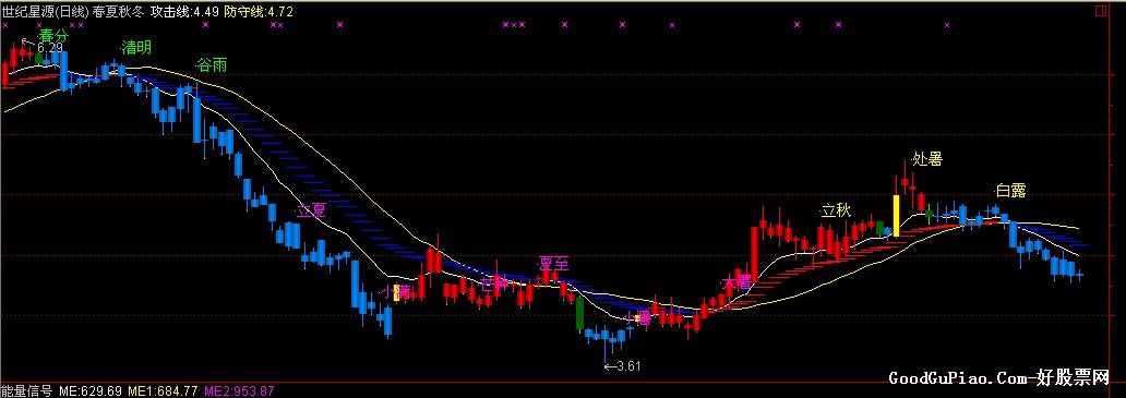 相关简介:通达信春夏秋冬主图 LC:=REF(CLOSE,1); RSI:=((SMA(MAX((CLOSE - LC),0),3,1) / SMA(ABS((CLOSE - LC)),3,1)) * 100); FF:=EMA(CLOSE,3); MA15:=EMA(CLOSE,21); 攻击线: EMA((EMA(CLOSE,4)+EMA(CLOSE,6)+EMA(CLOSE,12)+EMA(CLOSE,24))/4,2),LINETHICK1,COLORFFFFFF; 防守线: MA(CLOSE,2