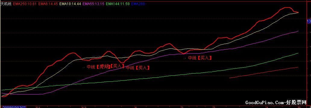 相关简介:通达信天机线指标源码 EMA250:MA(C,250),COLORRED; EMA6:MA(C,6),COLORRED LINETHICK2; EMA18:MA(C,18),COLORYELLOW; EMA55:MA(C,55),COLORFF00FF; EMA144:MA(C,144),COLORGREEN; EMA288:MA(C,288),COLORBLUE; 中线【买入】:=COUNT(CLOSEEMA18,5)=4 AND CLOSE/EMA181.004 AND CROSS(CLOS