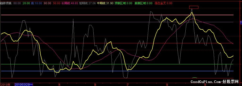 下面来介绍方法!那个时候我先观察灰色线触底了了!在08年4月1号的时候我当时的想法!灰色线是短周期线那么这种股票可以作个短线风险估计会小!那么就密切观察他!开始关注底部区域的换手!同时等待灰色线的拐头向上的机会!终于灰色线在4月2号开始拐头向上!那么这个时候立刻选择进场!(要点这种股票最好是价位是底部区域的,同时灰色线触底紫色线)进场后拿着股票这样灰色线拐头不向下就拿着!如果你选择一直做短线的话!那么就可以按照股票的日线图的QSDD灰色线一直做!拐头向上就进场,拐头向下力马离场!如果你愿意做中线那么就要看黄色线!话还回到前面我进场以后观察换手和量能!不错不断的放大!接着我观察黄色线拐头也向上了!那么坚定信心做中线!黄线是在4月5号有明显向上迹象那么继续持有!我介绍过红线是个长期线如果你发现的股票的QSDD红线也是拐头向上的,那么这种股票长线可以做!4月15号的时候红线开始拐头向上!那么这个时候我选择了继续持股!那么LP后来就是一路拉升!灰色线有过高位几次波动!我还是继续持股因为这个时候黄色线和红色线2线支持股价攀升!那么大胆的持股!终于在5月13号的这天黄线也达到顶部而且灰色线已经再次出现拐头向下!而且QSDD的顶部提示信号出来!我立刻提高警觉果然5月14LP冲高并且放天量我一看坏了!一个字跑!黄色线也拐头向下!我选择46.8挂单走人!后来的一切大家也都知道!一路回落!QSDD的3线也是一路的拐头向下!我看了一下LP的BS点!B点发的还算及时!但这个S点!发的有点晚!如果按QSDD指标的话!你可以直接逃顶!而不是选择5月16号在跑!