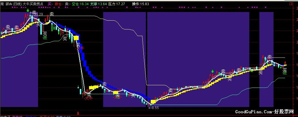 买:IF(CROSS(指导线,界) OR CROSS(买线,卖线),C,DRAWNULL),COLORMAGENTA,NODRAW;