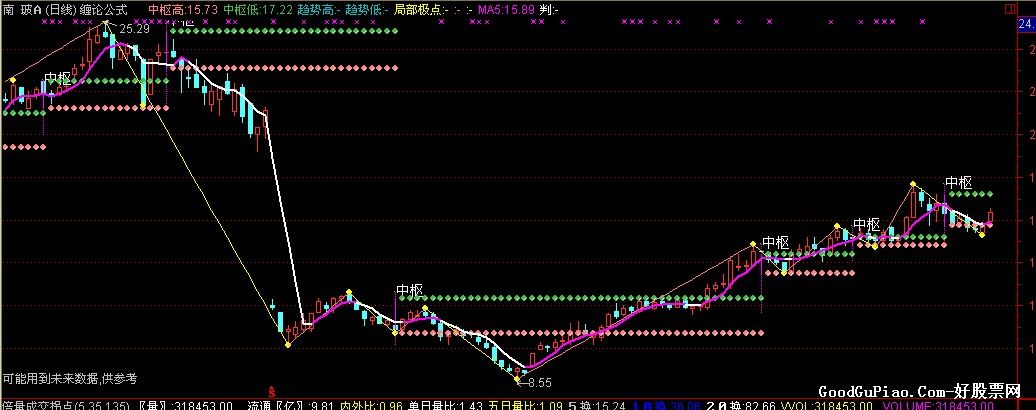 中枢低:PLOYLINE(DISP=2,REF(ZSG,BARSLAST(TJ8))),CIRCLEDOT,COLORLIGREEN;