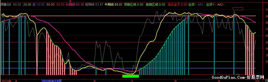 顶部区域:(中期线80) AND (REF(短期线,1)>95 OR REF(短期线,2)>95 ) AND 长期线>60 AND 短期线<83.5